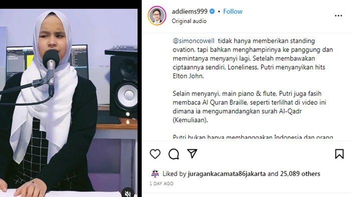 “Selain menyanyi, main piano & flute, Putri juga fasih membaca Al Quran Braille, seperti terlihat di video ini dimana ia mengumandangkan surah Al-Qadr (Kemuliaan),” tulis Addie MS diunggahan Instagram pribadinya.