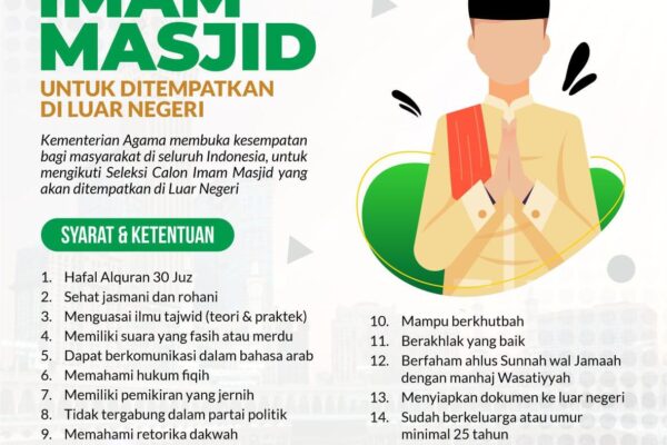 [JAKARTA, MASJIDUNA]—Kementerian Agama (Kemenag) membuka seleksi Imam Masjid yang akan ditempatkan di ndi Uni Emirat Arab (UEA). Seleksi ini ditujukan untuk seluruh umat Islam di Indonesia yang memiliki kriteria sesuai syarat yang telah ditentukan. Direktur Penerangan Agama Islam, Juraidi mengatakan seleksi calon imam ini digelar untuk memenuhi permintaan dari Uni Emirat Arab terkait imam masjid…